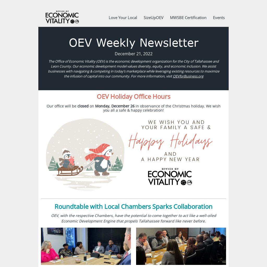 The Office of Economic Vitality (OEV) is the economic development organization for the City of Tallahassee and Leon County. Our economic development model values diversity, equity, and economic inclusion. We assist businesses with navigating & competing in today’s marketplace while leveraging existing resources to maximize the infusion of capital into our community. For more information, visit OEVforBusiness.org