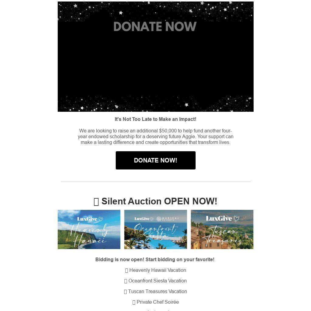 Escape the ordinary and step into a world of adventure with our exclusive raffle, where the prize is your dream getaway! Hosted by Aggie Impact Gala, this raffle gives you the ultimate chance to choose your own vacation destination. Whether it's a serene beach retreat, a bustling city escape, or a thrilling mountain adventure, the choice is yours!