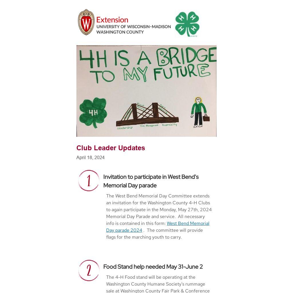 The West Bend Memorial Day Committee extends an invitation for the Washington County 4-H Clubs to again participate in the Monday, May 27th, 2024 Memorial Day Parade and service. All necessary info is contained in this form: West Bend Memorial Day parade 2024 . The committee will provide flags for the marching youth to carry.