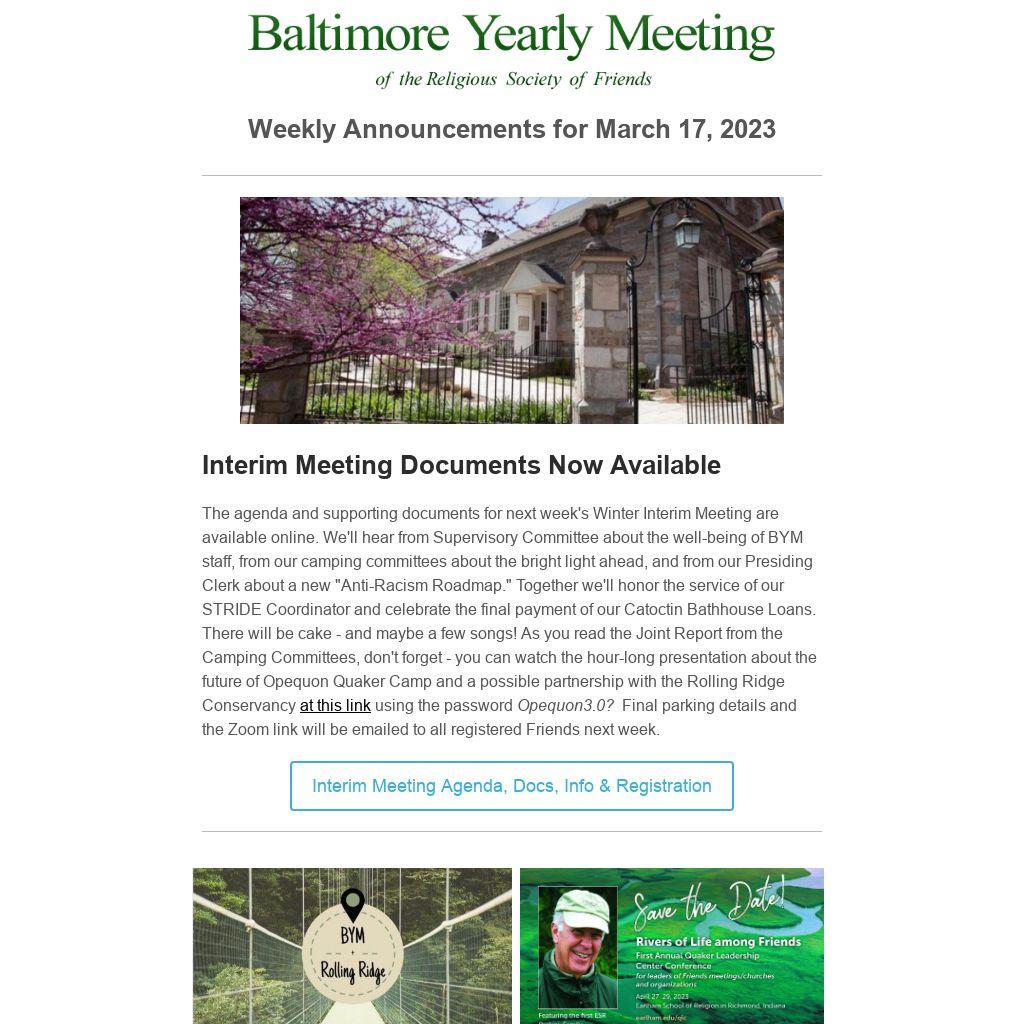 The agenda and supporting documents for next week's Winter Interim Meeting are available online. We'll hear from Supervisory Committee about the well-being of BYM staff, from our camping committees about the bright light ahead, and from our Presiding Clerk about a new "Anti-Racism Roadmap." Together we'll honor the service of our STRIDE Coordinator and celebrate the final payment of our Catoctin Bathhouse Loans. There will be cake - and maybe a few songs! As you read the Joint Report from the Camping Committees, don't forget - you can watch the hour-long presentation about the future of Opequon Quaker Camp and a possible partnership with the Rolling Ridge Conservancy at this link using the password Opequon3.0? Final parking details and the Zoom link will be emailed to all registered Friends next week.