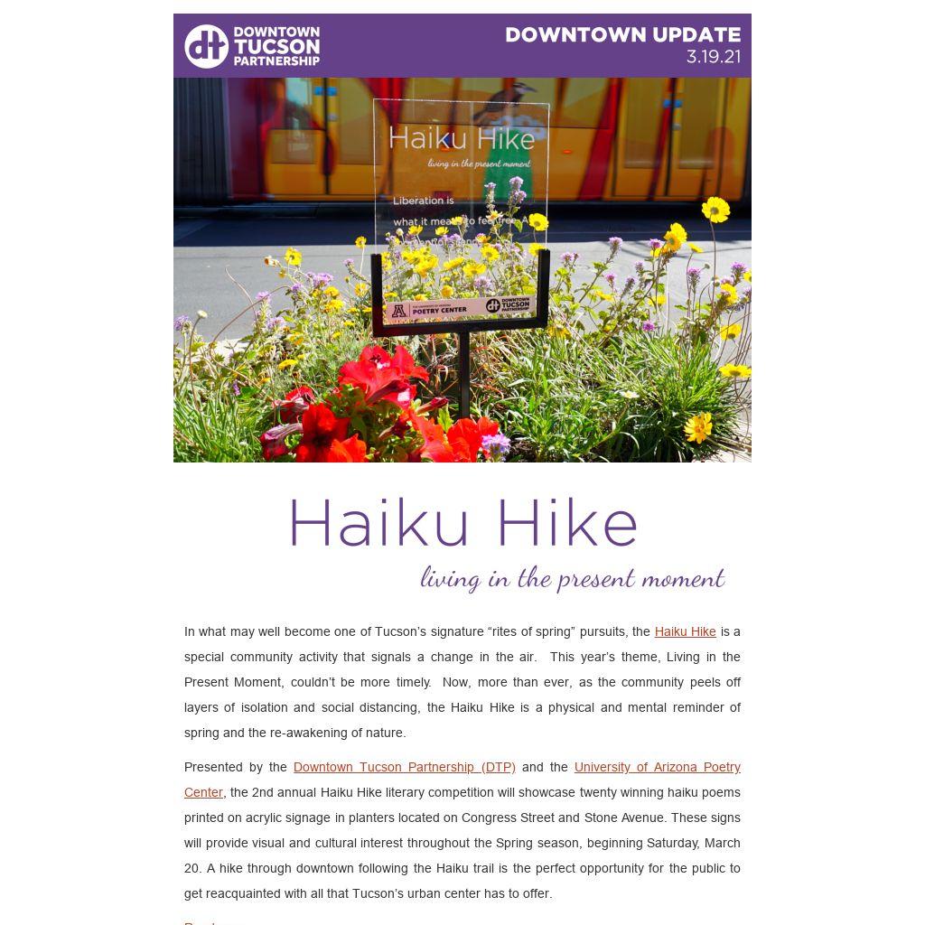 Presented by the Downtown Tucson Partnership (DTP) and the University of Arizona Poetry Center, the 2nd annual Haiku Hike literary competition will showcase twenty winning haiku poems printed on acrylic signage in planters located on Congress Street and Stone Avenue. These signs will provide visual and cultural interest throughout the Spring season, beginning Saturday, March 20. A hike through downtown following the Haiku trail is the perfect opportunity for the public to get reacquainted with all that Tucson’s urban center has to offer.