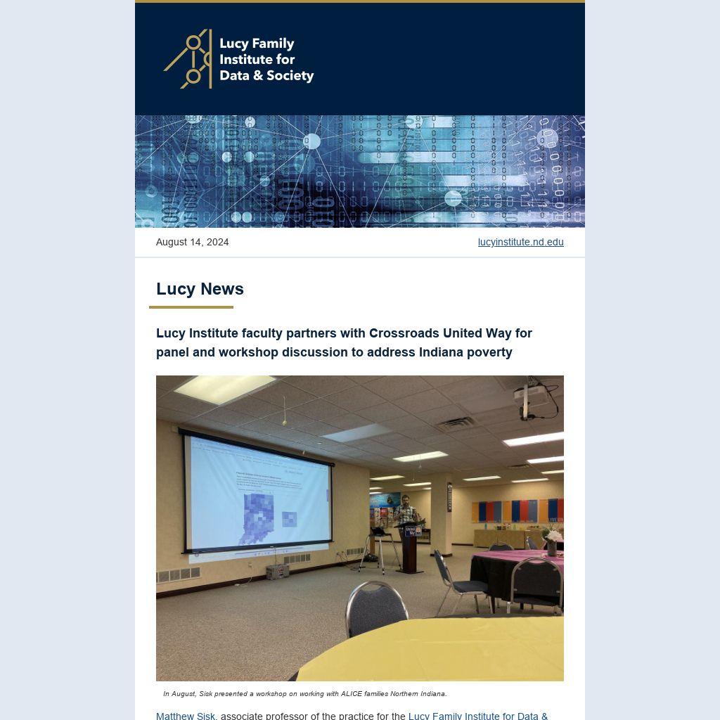 Matthew Sisk, associate professor of the practice for the Lucy Family Institute for Data & Society, participated in panel and workshop discussions hosted by Crossroads United Way of Elkhart, Lagrange, and Noble Counties.