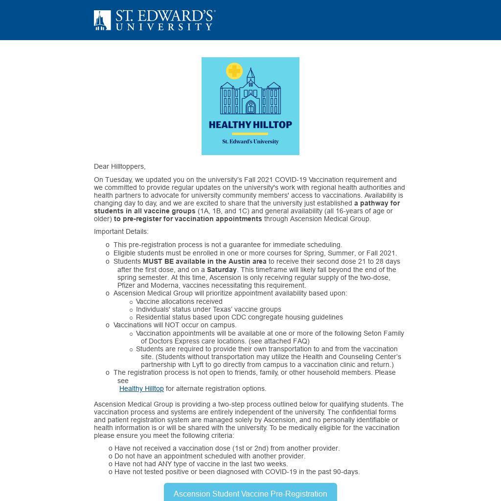 On Tuesday, we updated you on the university’s Fall 2021 COVID-19 Vaccination requirement and we committed to provide regular updates on the university's work with regional health authorities and health partners to advocate for university community members' access to vaccinations. Availability is changing day to day, and we are excited to share that the university just established a pathway for students in all vaccine groups (1A, 1B, and 1C) and general availability (all 16-years of age or older) to pre-register for vaccination appointments through Ascension Medical Group.