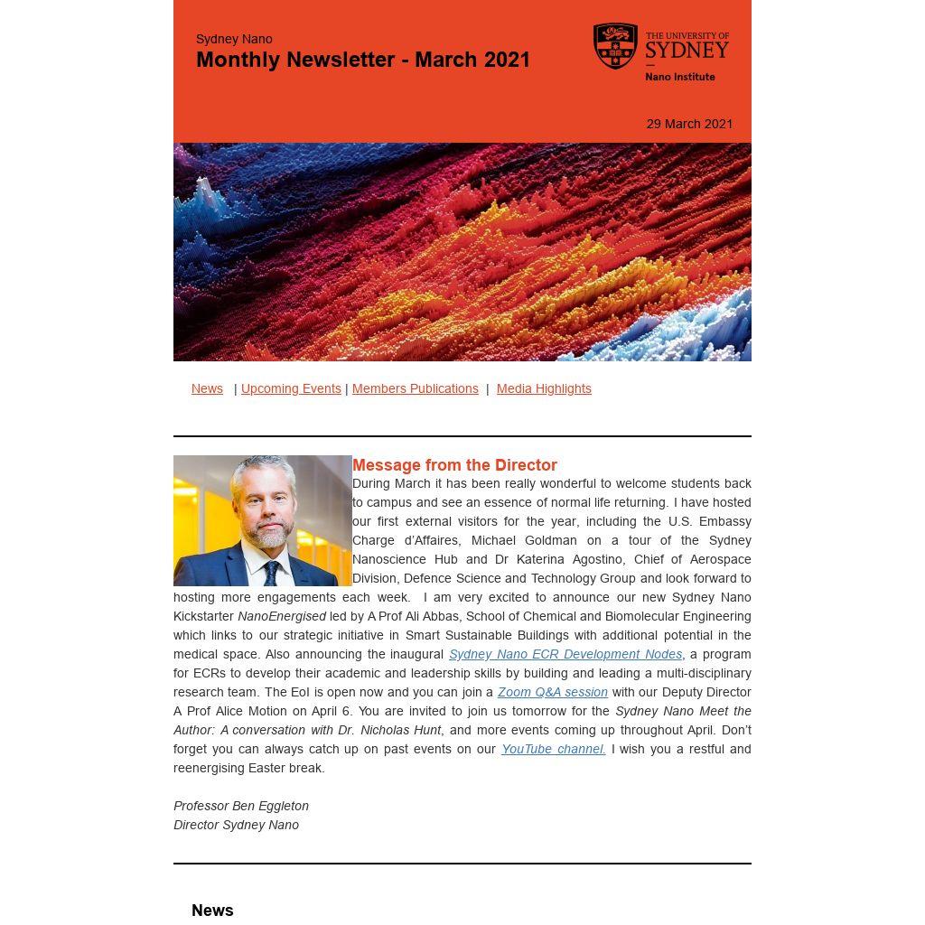 Message from the DirectorDuring March it has been really wonderful to welcome students back to campus and see an essence of normal life returning. I have hosted our first external visitors for the year, including the U.S. Embassy Charge d’Affaires, Michael Goldman on a tour of the Sydney Nanoscience Hub and Dr Katerina Agostino, Chief of Aerospace Division, Defence Science and Technology Group and look forward to hosting more engagements each week. I am very excited to announce our new Sydney Nano Kickstarter NanoEnergised led by A Prof Ali Abbas, School of Chemical and Biomolecular Engineering which links to our strategic initiative in Smart Sustainable Buildings with additional potential in the medical space. Also announcing the inaugural Sydney Nano ECR Development Nodes, a program for ECRs to develop their academic and leadership skills by building and leading a multi-disciplinary research team. The EoI is open now and you can join a Zoom Q&A session with our Deputy Director A Prof Alice Motion on April 6. You are invited to join us tomorrow for the Sydney Nano Meet the Author: A conversation with Dr. Nicholas Hunt, and more events coming up throughout April. Don’t forget you can always catch up on past events on our YouTube channel. I wish you a restful and reenergising Easter break. Professor Ben Eggleton