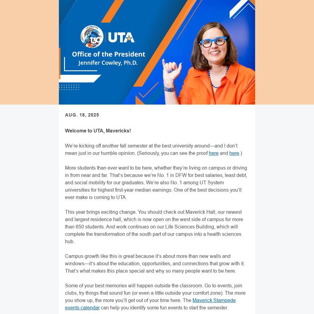 So drink plenty of water, cheer each other on, stay cool (literally), and make this semester count. We’re glad you’re here. And if you’re new, welcome to UTA and the Maverick family.