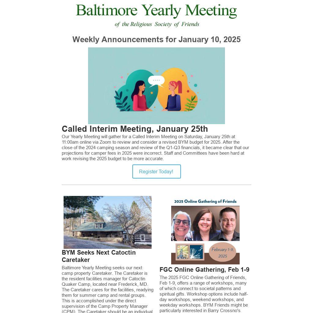 Our Yearly Meeting will gather for a Called Interim Meeting on Saturday, January 25th at 11:00am online via Zoom to review and consider a revised BYM budget for 2025. After the close of the 2024 camping season and review of the Q1-Q3 financials, it became clear that our projections for camper fees in 2025 were incorrect. Staff and Committees have been hard at work revising the 2025 budget to be more accurate.