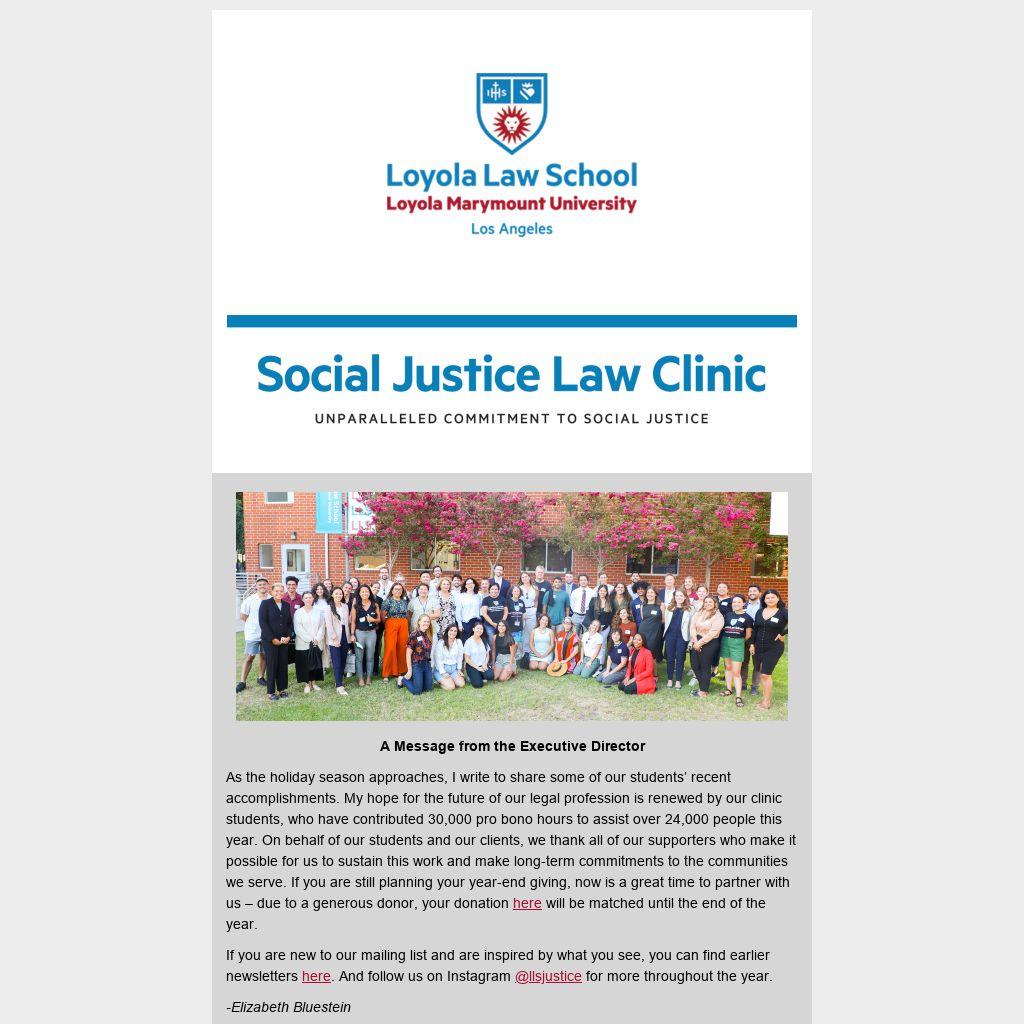 As the holiday season approaches, I write to share some of our students’ recent accomplishments. My hope for the future of our legal profession is renewed by our clinic students, who have contributed 30,000 pro bono hours to assist over 24,000 people this year. On behalf of our students and our clients, we thank all of our supporters who make it possible for us to sustain this work and make long-term commitments to the communities we serve. If you are still planning your year-end giving, now is a great time to partner with us – due to a generous donor, your donation here will be matched until the end of the year.