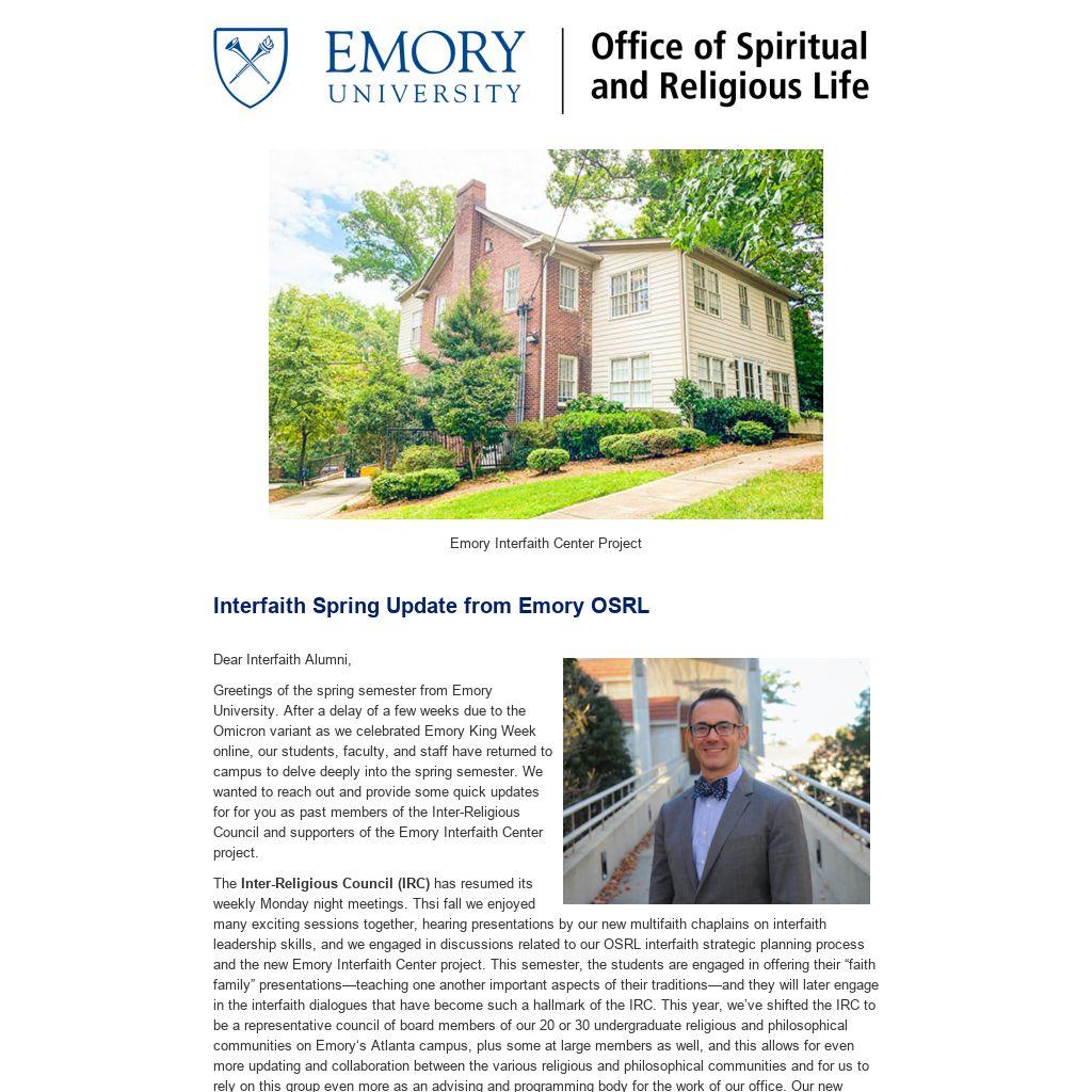 Greetings of the spring semester from Emory University. After a delay of a few weeks due to the Omicron variant as we celebrated Emory King Week online, our students, faculty, and staff have returned to campus to delve deeply into the spring semester. We wanted to reach out and provide some quick updates for for you as past members of the Inter-Religious Council and supporters of the Emory Interfaith Center project.