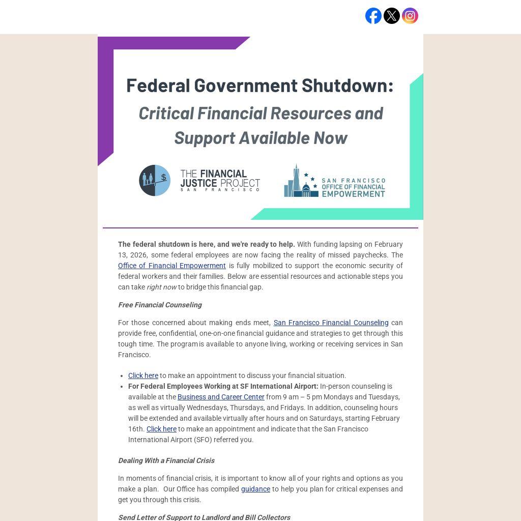 The federal shutdown is here, and we're ready to help. With funding lapsing on February 13, 2026, some federal employees are now facing the reality of missed paychecks. The Office of Financial Empowerment is fully mobilized to support the economic security of federal workers and their families. Below are essential resources and actionable steps you can take right now to bridge this financial gap.