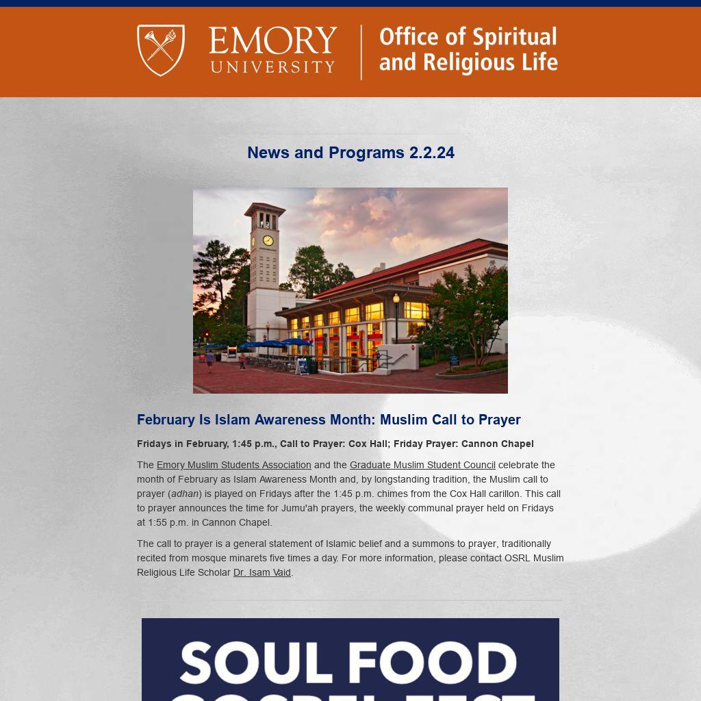 Emory OSRL ENews is published weekly during term by the Emory University Office of Spiritual and Religious Life publicizing Atlanta-campus spiritual life programs. It is not a comprehensive listing. For Oxford College spiritual life, please click here. To submit information or to update your preferences, please contact religiouslife@emory.edu.