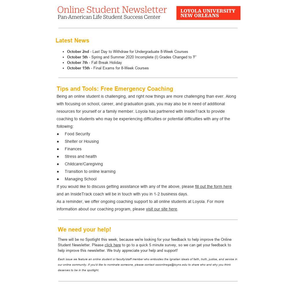 There will be no Spotlight this week, because we're looking for your feedback to help improve the Online Student Newsletter. Please click here to go to a quick 5 minute survey, so we can get your feedback to help improve this newsletter. We truly appreciate your help and support!