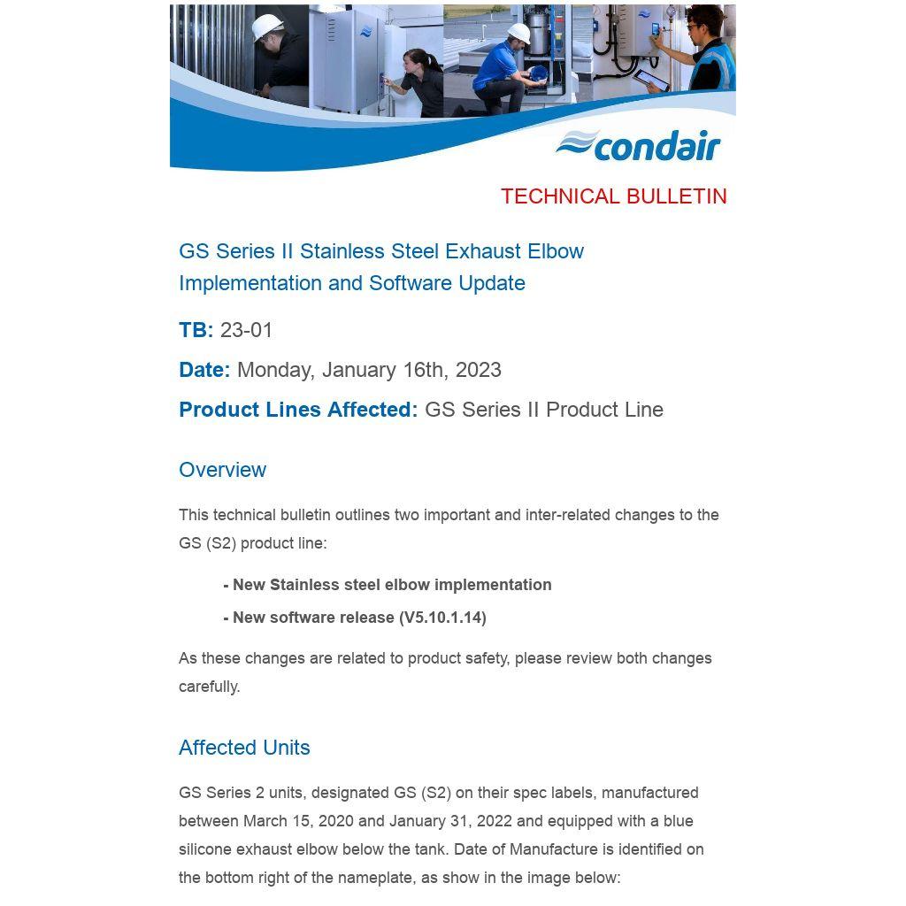 GS Series II Stainless Steel Exhaust Elbow Implementation and Software Update