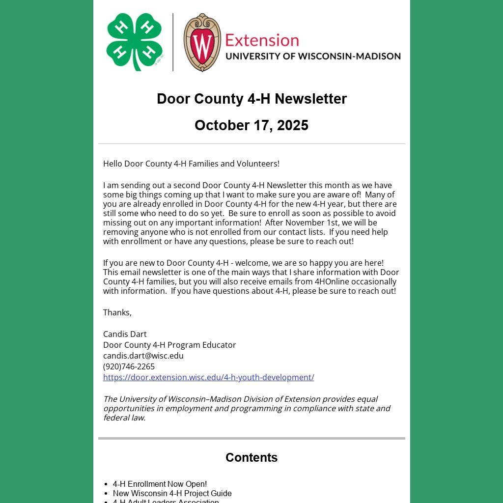 I am sending out a second Door County 4-H Newsletter this month as we have some big things coming up that I want to make sure you are aware of! Many of you are already enrolled in Door County 4-H for the new 4-H year, but there are still some who need to do so yet. Be sure to enroll as soon as possible to avoid missing out on any important information! After November 1st, we will be removing anyone who is not enrolled from our contact lists. If you need help with enrollment or have any questions, please be sure to reach out!