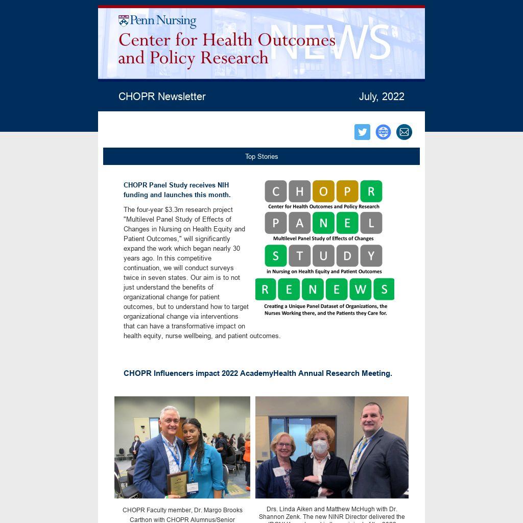 The CHOPR Newsletter is published quarterly by the Center for Health Outcomes and Policy Research, University of Pennsylvania School of Nursing, Philadelphia. PA. Contact Andrea Barol with any questions or comments at ajb@nursing.upenn.edu.