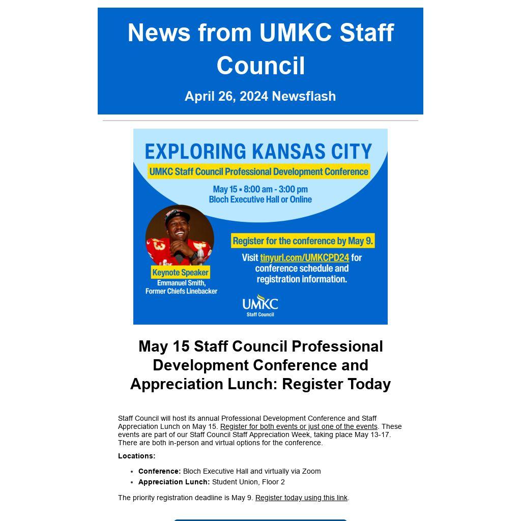 UMKC Staff Council Staff Appreciation Week takes place May 13-17. The purpose of this appreciation week is to celebrate our hardworking UMKC staff. We invite all UMKC staff to attend our events, including our signature Staff Appreciation Lunch (happening on the same day as the Staff Council Professional Development Conference). Learn more on the Staff Council Staff Appreciation Week website.