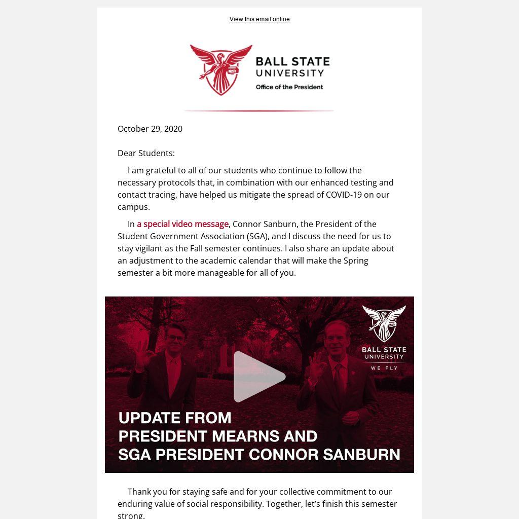 In a special video message, Connor Sanburn, the President of the Student Government Association (SGA), and I discuss the need for us to stay vigilant as the Fall semester continues. I also share an update about an adjustment to the academic calendar that will make the Spring semester a bit more manageable for all of you.