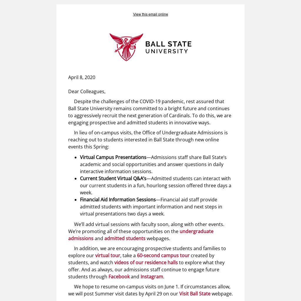 Despite the challenges of the COVID-19 pandemic, rest assured that Ball State University remains committed to a bright future and continues to aggressively recruit the next generation of Cardinals. To do this, we are engaging prospective and admitted students in innovative ways.