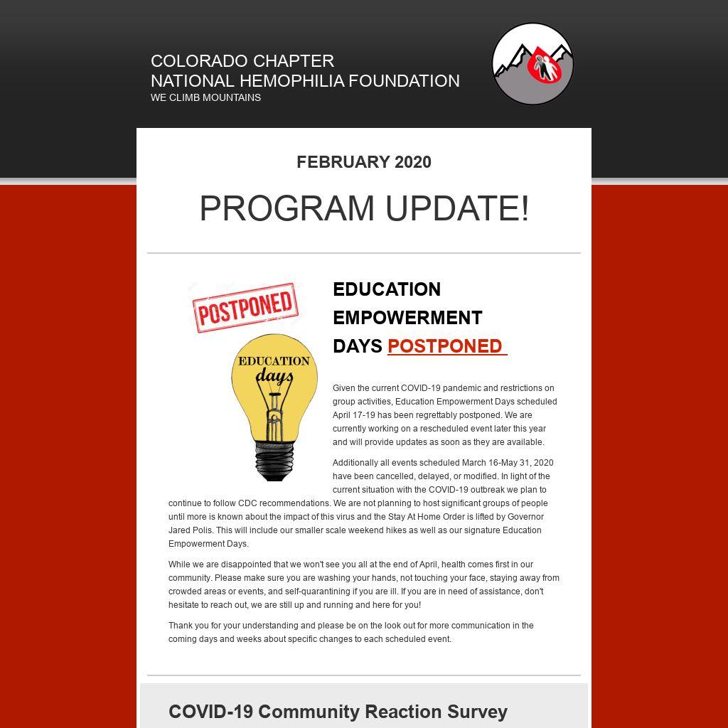 Additionally all events scheduled March 16-May 31, 2020 have been cancelled, delayed, or modified. In light of the current situation with the COVID-19 outbreak we plan to continue to follow CDC recommendations. We are not planning to host significant groups of people until more is known about the impact of this virus and the Stay At Home Order is lifted by Governor Jared Polis. This will include our smaller scale weekend hikes as well as our signature Education Empowerment Days.