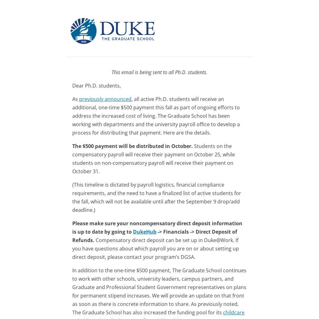 Please make sure your noncompensatory direct deposit information is up to date by going to DukeHub -> Financials -> Direct Deposit of Refunds. Compensatory direct deposit can be set up in Duke@Work. If you have questions about which payroll you are on or about setting up direct deposit, please contact your program’s DGSA.