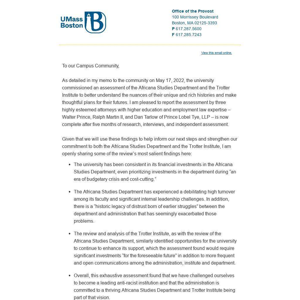 As detailed in my memo to the community on May 17, 2022, the university commissioned an assessment of the Africana Studies Department and the Trotter Institute to better understand the nuances of their unique and rich histories and make thoughtful plans for their futures. I am pleased to report the assessment by three highly esteemed attorneys with higher education and employment law expertise – Walter Prince, Ralph Martin II, and Dan Tarlow of Prince Lobel Tye, LLP – is now complete after five months of research, interviews, and independent assessment.