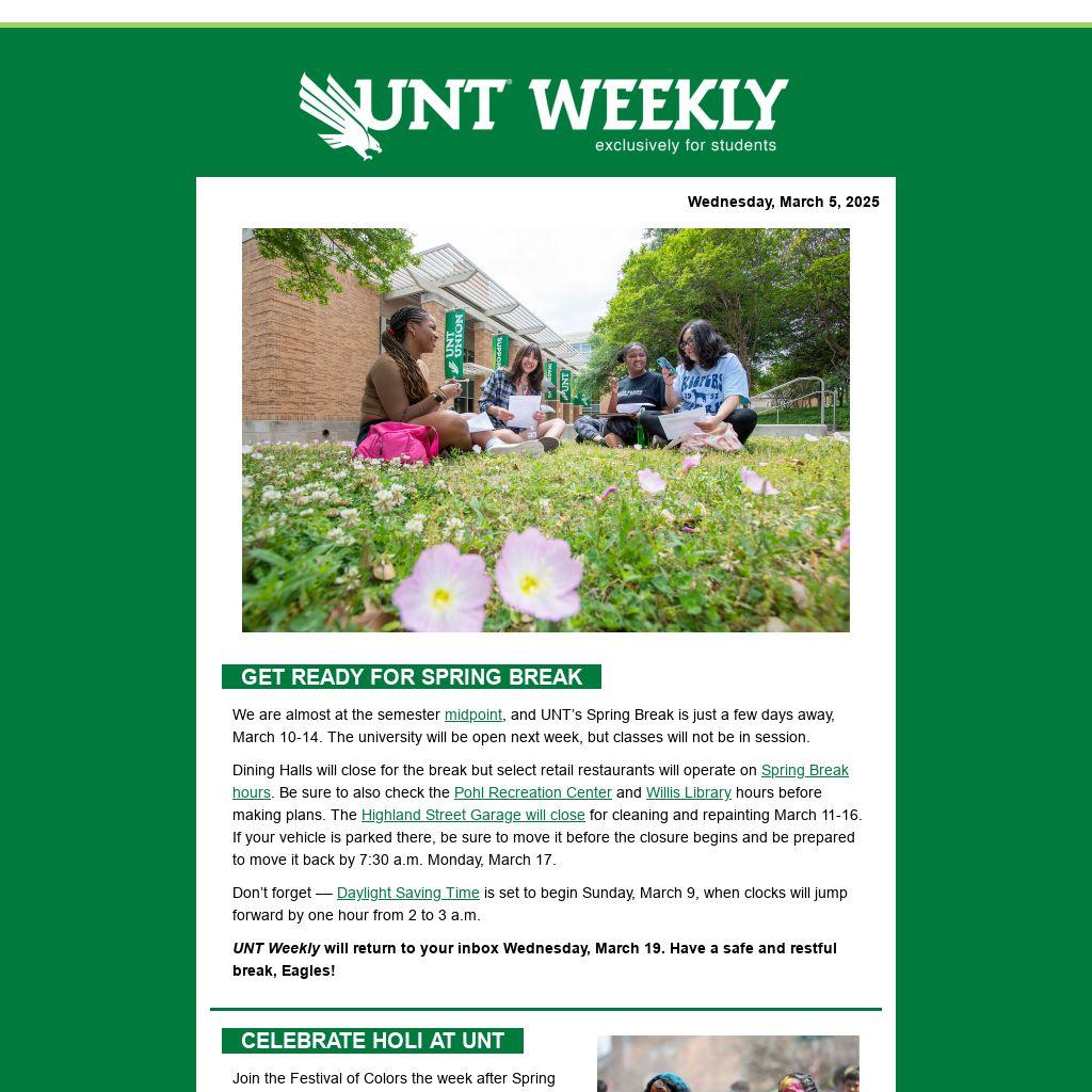 UNT Weekly will return to your inbox Wednesday, March 19. Have a safe and restful break, Eagles!