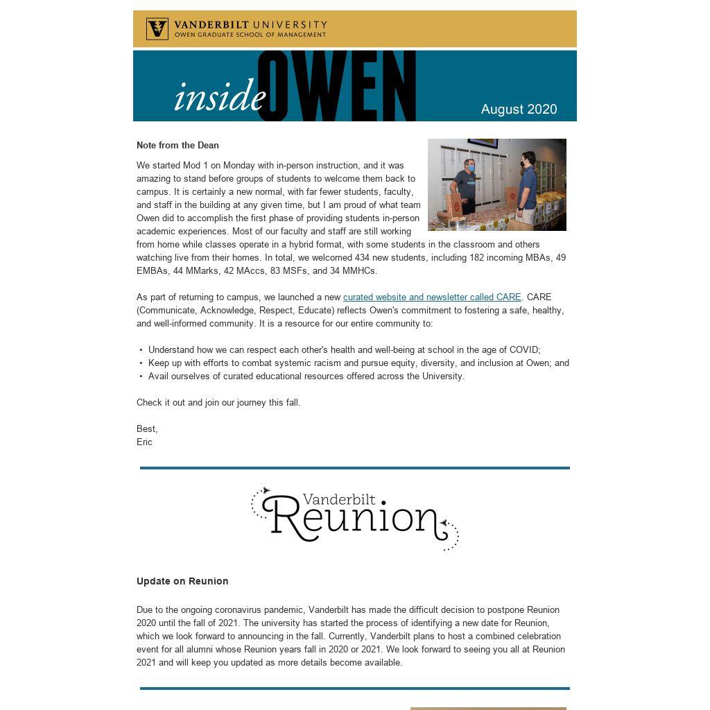 We started Mod 1 on Monday with in-person instruction, and it was amazing to stand before groups of students to welcome them back to campus. It is certainly a new normal, with far fewer students, faculty, and staff in the building at any given time, but I am proud of what team Owen did to accomplish the first phase of providing students in-person academic experiences. Most of our faculty and staff are still working from home while classes operate in a hybrid format, with some students in the classroom and others watching live from their homes. In total, we welcomed 434 new students, including 182 incoming MBAs, 49 EMBAs, 44 MMarks, 42 MAccs, 83 MSFs, and 34 MMHCs. As part of returning to campus, we launched a new curated website and newsletter called CARE. CARE (Communicate, Acknowledge, Respect, Educate) reflects Owen's commitment to fostering a safe, healthy, and well-informed community. It is a resource for our entire community to: