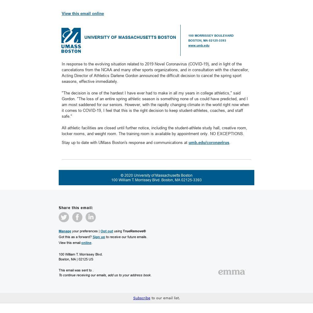 In response to the evolving situation related to 2019 Novel Coronavirus (COVID-19), and in light of the cancelations from the NCAA and many other sports organizations, and in consultation with the chancellor, Acting Director of Athletics Darlene Gordon announced the difficult decision to cancel the spring sport seasons, effective immediately.