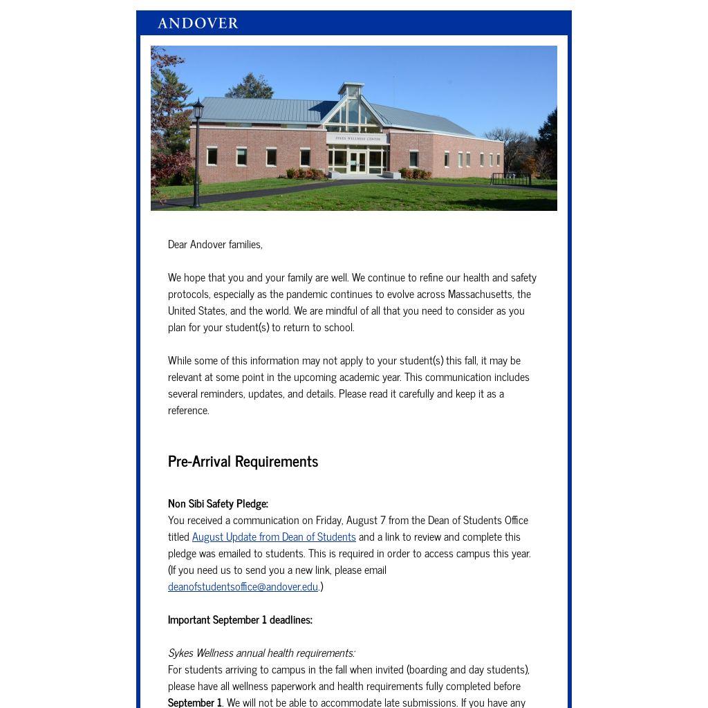 Non Sibi Safety Pledge: You received a communication on Friday, August 7 from the Dean of Students Office titled August Update from Dean of Students and a link to review and complete this pledge was emailed to students. This is required in order to access campus this year. (If you need us to send you a new link, please email deanofstudentsoffice@andover.edu.)