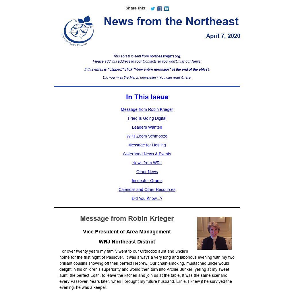 Message from Robin Krieger Vice President of Area Management WRJ Northeast District For over twenty years my family went to our Orthodox aunt and uncle’s home for the first night of Passover. It was always a very long and laborious evening with my two brilliant cousins showing off their perfect Hebrew. Our chain-smoking, mustached uncle would delight in his children’s superiority and would then turn into Archie Bunker, yelling at my sweet aunt, the perfect Edith, to leave the kitchen and join us at the table. It was the same scenario every Passover. Years later, when I brought my future husband, Ernie, I knew if he survived the evening, he was a keeper.