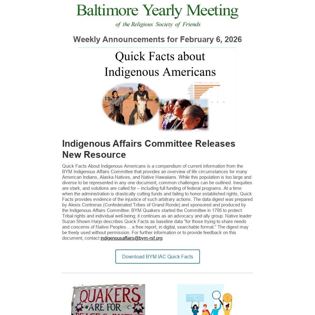 Quick Facts About Indigenous Americans is a compendium of current information from the BYM Indigenous Affairs Committee that provides an overview of life circumstances for many American Indians, Alaska Natives, and Native Hawaiians. While this population is too large and diverse to be represented in any one document, common challenges can be outlined. Inequities are stark, and solutions are called for – including full funding of federal programs. At a time when the administration is drastically cutting funds and failing to honor established rights, Quick Facts provides evidence of the injustice of such arbitrary actions. The data digest was prepared by Alexis Contreras (Confederated Tribes of Grand Ronde) and sponsored and produced by the Indigenous Affairs Committee. BYM Quakers started the Committee in 1795 to protect Tribal rights and individual well-being; it continues as an advocacy and ally group. Native leader Suzan Shown Harjo describes Quick Facts as baseline data “for those trying to share needs and concerns of Native Peoples… a free report, in digital, searchable format.” The digest may be freely used without permission. For further information or to provide feedback on this document, contact indigenousaffairs@bym-rsf.org