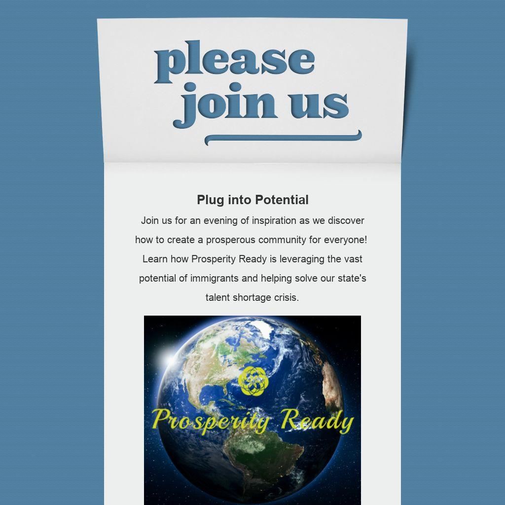 Plug into Potential Join us for an evening of inspiration as we discover how to create a prosperous community for everyone! Learn how Prosperity Ready is leveraging the vast potential of immigrants and helping solve our state's talent shortage crisis.