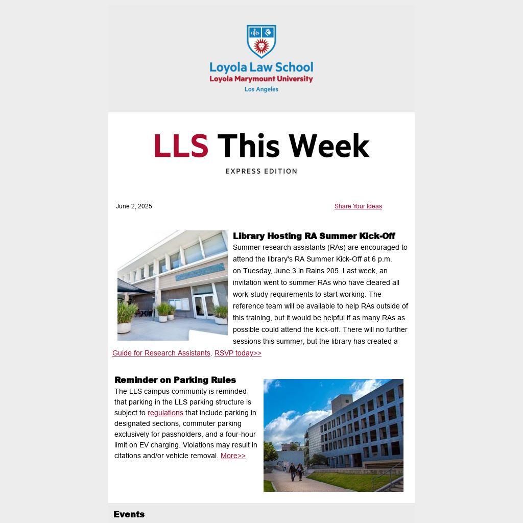 Official law school events are noted above or summarized in the space below. Event coordinators are encouraged to use the LLS Events Calendar for events they want promoted broadly. Members of the LLS community should select "LOG IN WITH SCHOOL ID," which will prompt the system to use your single sign-on credentials to allow you to create posts. Note: You must select "Loyola Law School" in the department field in order for the event to display in the LLS roundup. Questions? Email us!