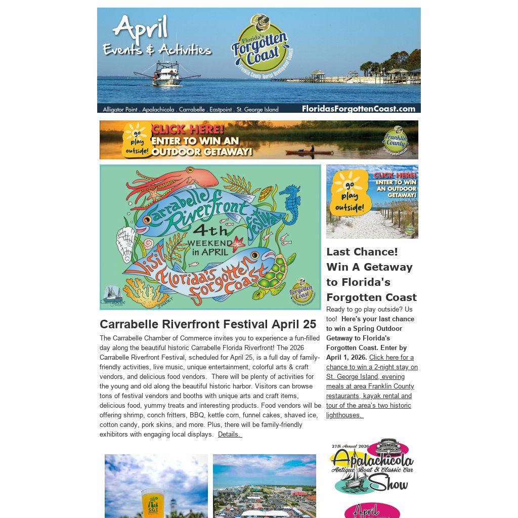 Carrabelle Riverfront Festival April 25 The Carrabelle Chamber of Commerce invites you to experience a fun-filled day along the beautiful historic Carrabelle Florida Riverfront! The 2026 Carrabelle Riverfront Festival, scheduled for April 25, is a full day of family-friendly activities, live music, unique entertainment, colorful arts & craft vendors, and delicious food vendors. There will be plenty of activities for the young and old along the beautiful historic harbor. Visitors can browse tons of festival vendors and booths with unique arts and craft items, delicious food, yummy treats and interesting products. Food vendors will be offering shrimp, conch fritters, BBQ, kettle corn, funnel cakes, shaved ice, cotton candy, pork skins, and more. Plus, there will be family-friendly exhibitors with engaging local displays. Details.