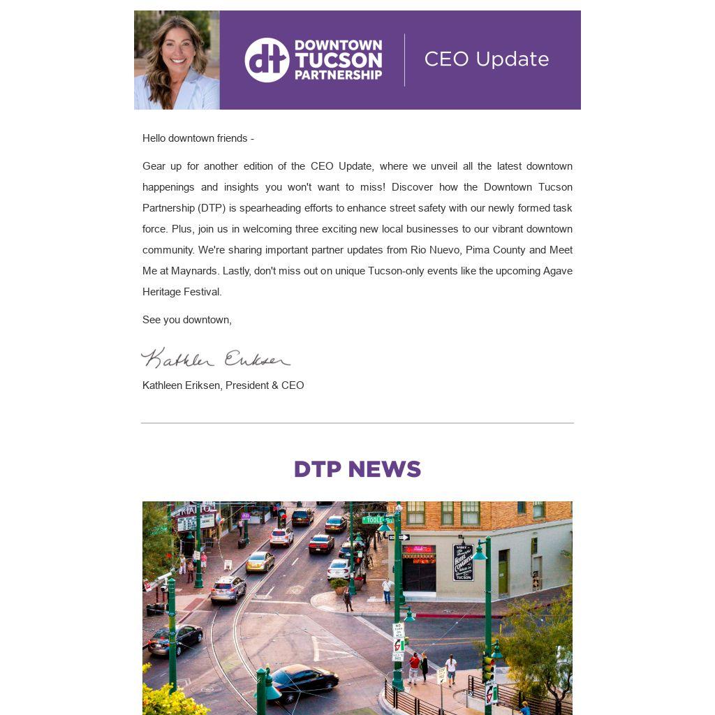 Gear up for another edition of the CEO Update, where we unveil all the latest downtown happenings and insights you won't want to miss! Discover how the Downtown Tucson Partnership (DTP) is spearheading efforts to enhance street safety with our newly formed task force. Plus, join us in welcoming three exciting new local businesses to our vibrant downtown community. We're sharing important partner updates from Rio Nuevo, Pima County and Meet Me at Maynards. Lastly, don't miss out on unique Tucson-only events like the upcoming Agave Heritage Festival.