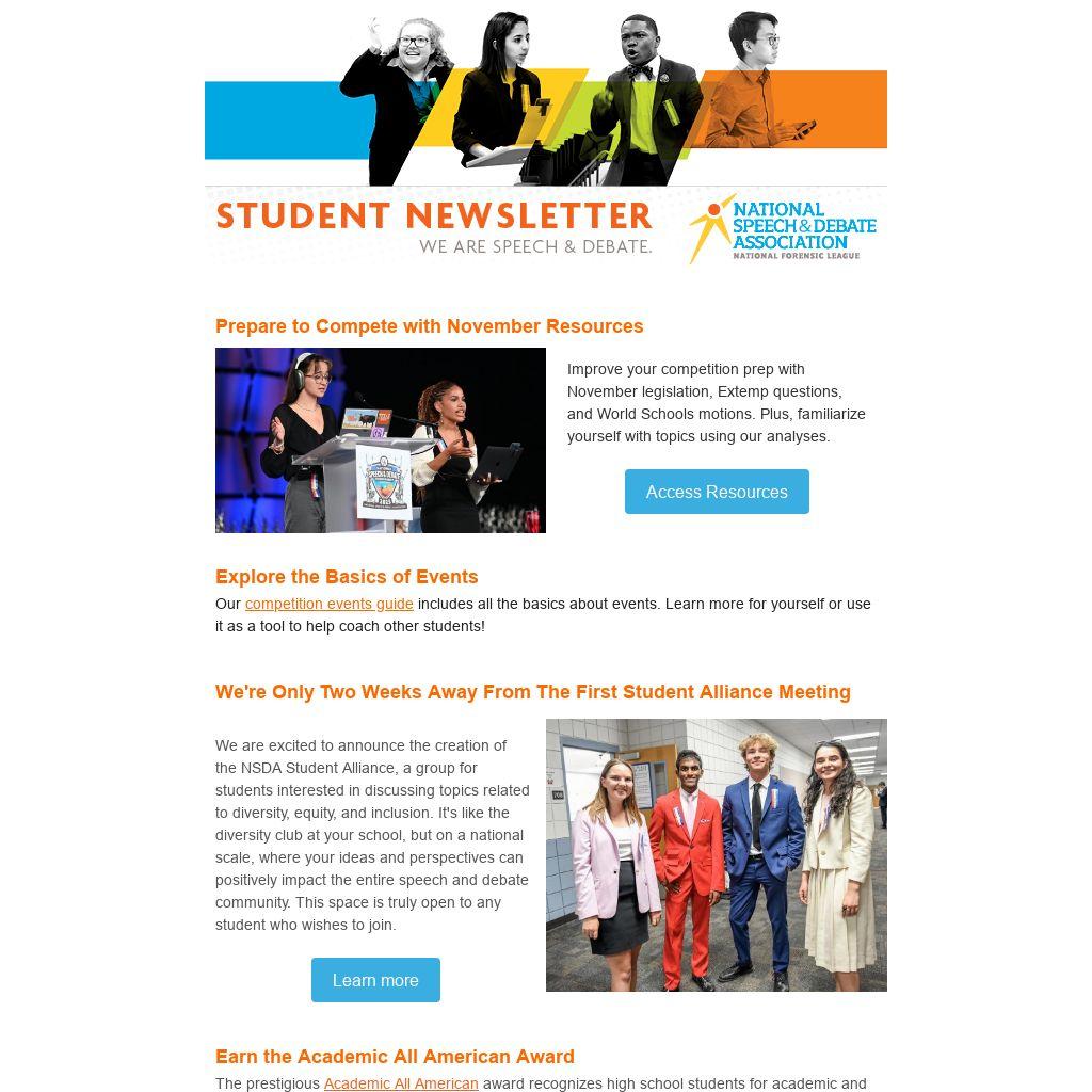 We are excited to announce the creation of the NSDA Student Alliance, a group for students interested in discussing topics related to diversity, equity, and inclusion. It's like the diversity club at your school, but on a national scale, where your ideas and perspectives can positively impact the entire speech and debate community. This space is truly open to any student who wishes to join.