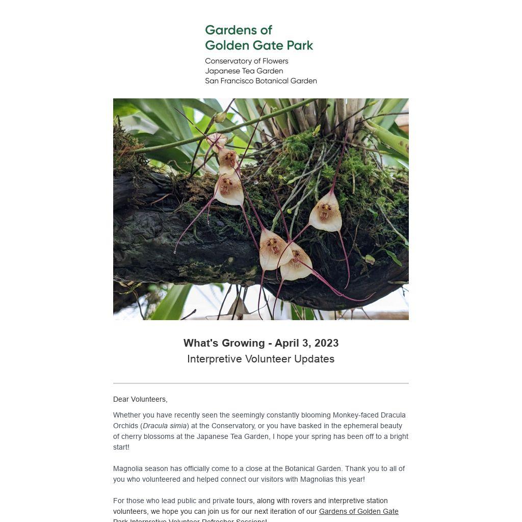 Join us as we gather volunteers & staff from all three gardens to share updates on how we are connecting volunteering opportunities within the Gardens of Golden Gate Park and answer your questions related to interpretive programs across the gardens. We hope you'll join us for this 3-meeting series if you lead tours, host interpretive stations, rove at the Conservatory of Flowers and Botanical Garden, or lead City Guide tours at the Japanese Tea Garden. We're excited to convene this wonderful community of volunteers together! RSVP Here.
