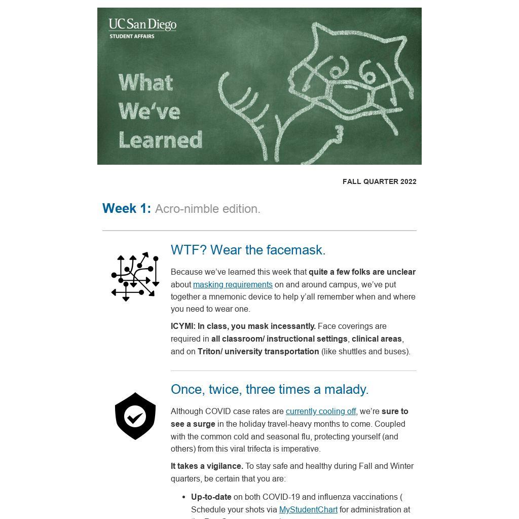 ICYMI: In class, you mask incessantly. Face coverings are required in all classroom/ instructional settings, clinical areas, and on Triton/ university transportation (like shuttles and buses).