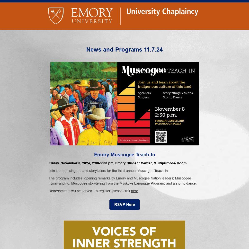 Emory University Chaplaincy ENews is published weekly during term publicizing Atlanta-campus spiritual life programs. It is not a comprehensive listing. For Oxford College spiritual life, please click here. To submit information or to update your preferences, please contact religiouslife@emory.edu.