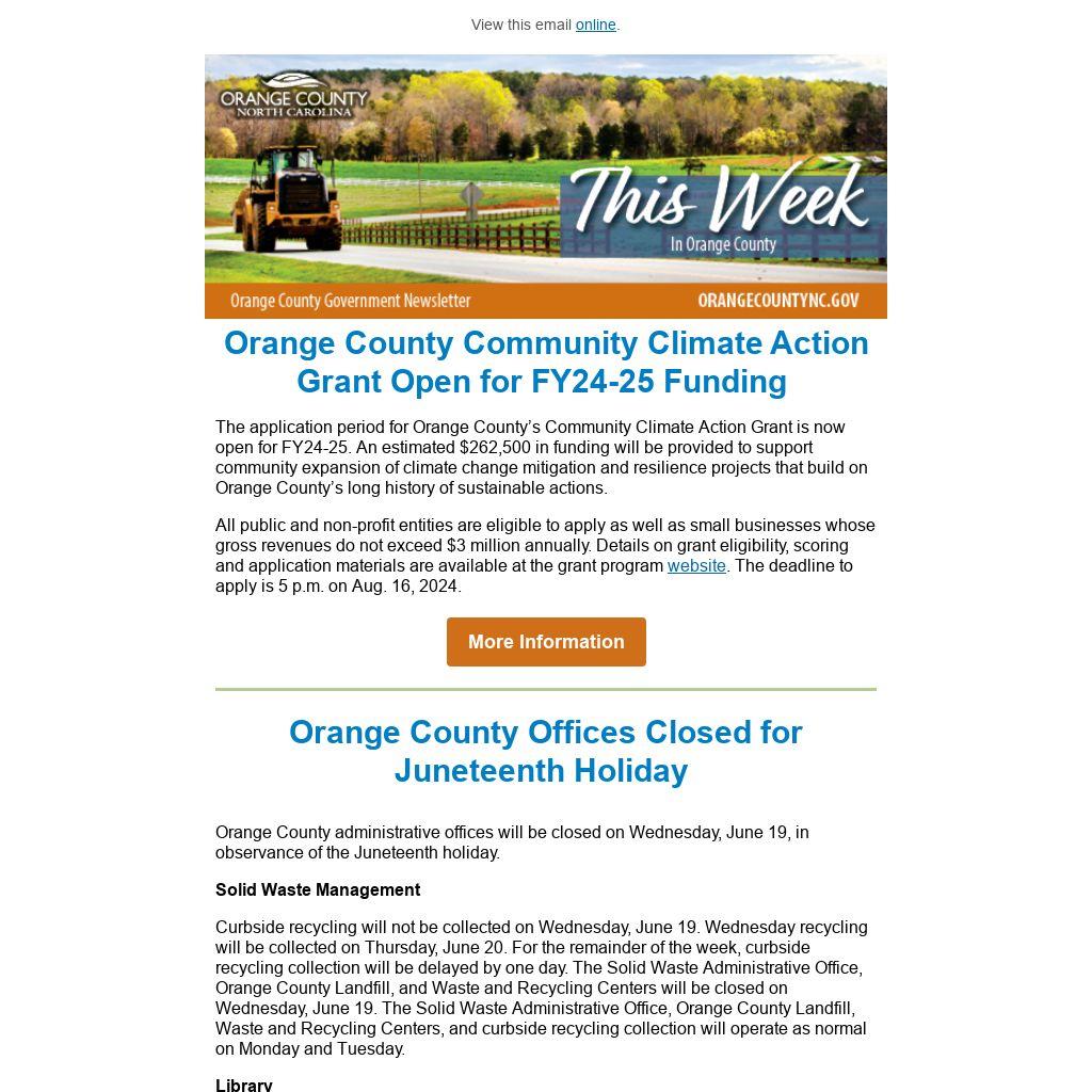 Orange County administrative offices will be closed on Wednesday, June 19, in observance of the Juneteenth holiday.