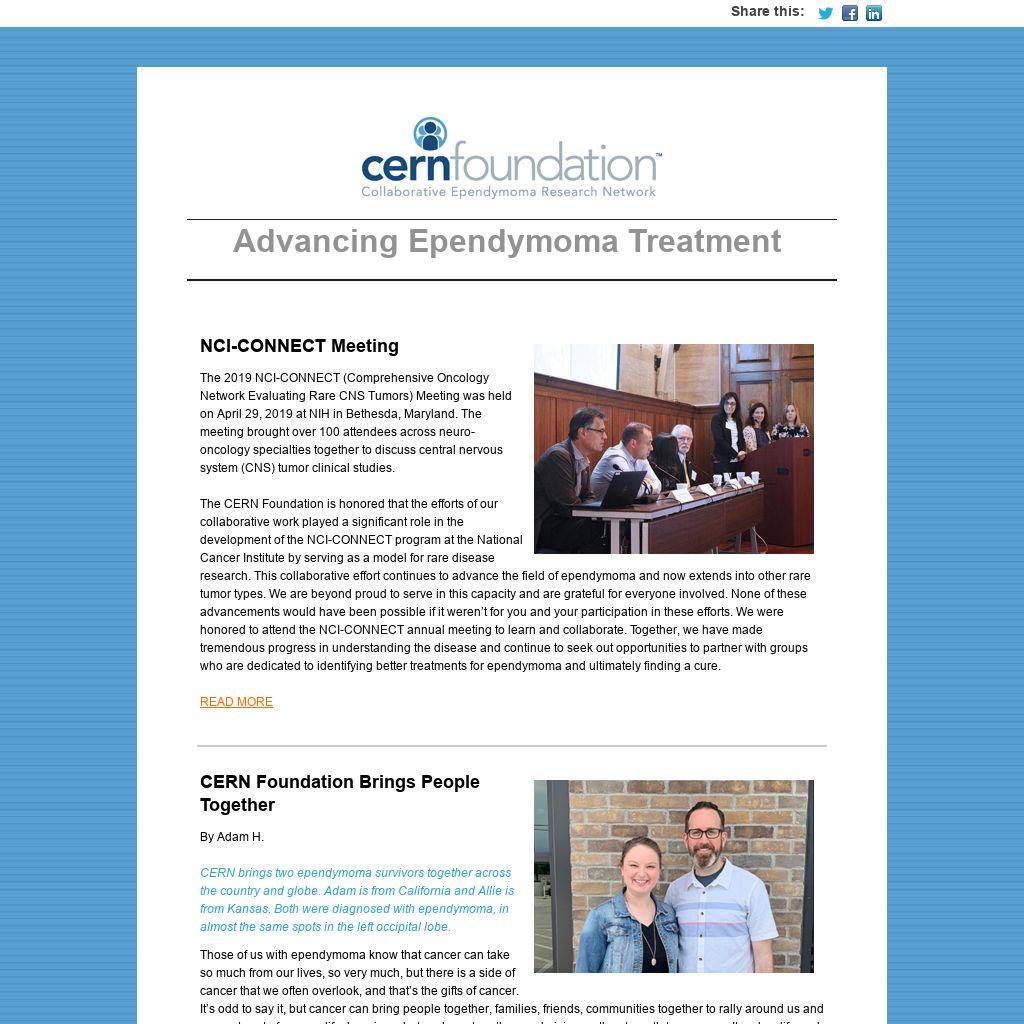 Those of us with ependymoma know that cancer can take so much from our lives, so very much, but there is a side of cancer that we often overlook, and that’s the gifts of cancer. It’s odd to say it, but cancer can bring people together, families, friends, communities together to rally around us and support us, to focus on life, keeping what we have together, and giving us the strength to press on. It makes life real and deep, more meaningful than what we may have ever experienced before. The CERN Foundation is a gift, fighting cancer, and supporting ependymoma patients in ways we could not do as individuals. In some respects, despite the pain and the uncertainty, cancer can be a gift. For Adam H. and Allie M. and their family and friends learned the goodness of cancer amongst the pain of cancer.