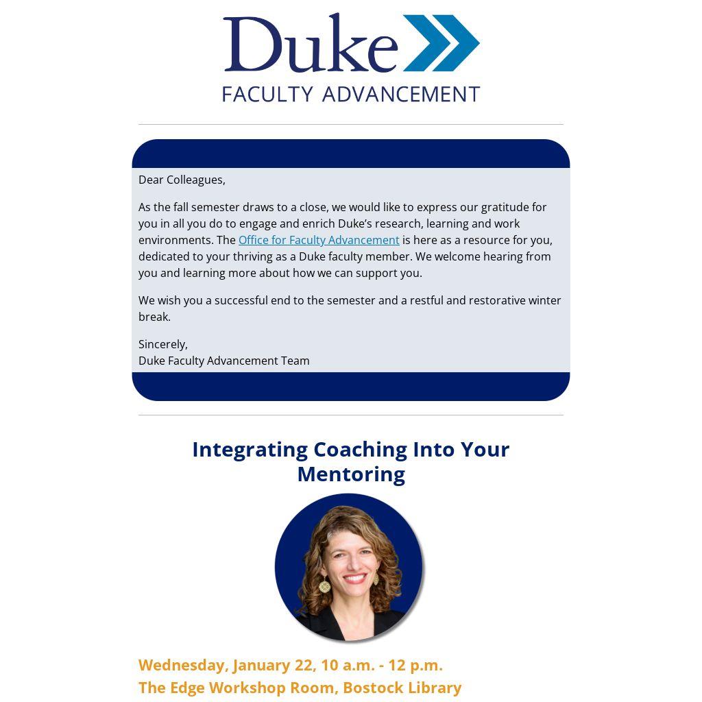 As the fall semester draws to a close, we would like to express our gratitude for you in all you do to engage and enrich Duke’s research, learning and work environments. The Office for Faculty Advancement is here as a resource for you, dedicated to your thriving as a Duke faculty member. We welcome hearing from you and learning more about how we can support you.