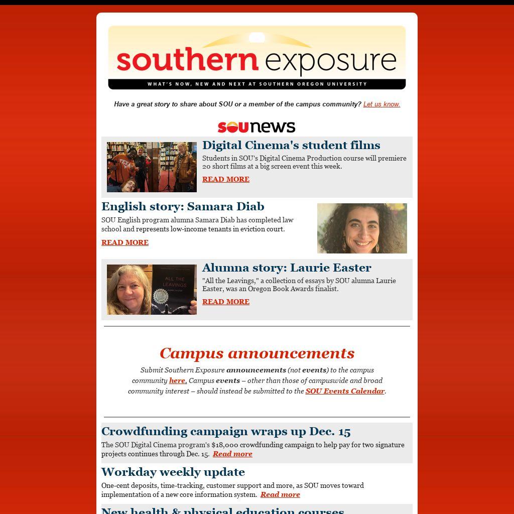 Submit Southern Exposure announcements (not events) to the campus community here. Campus events – other than those of campuswide and broad community interest – should instead be submitted to the SOU Events Calendar.