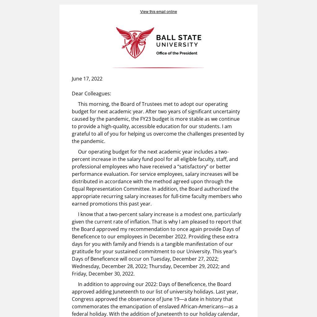 I know that a two-percent salary increase is a modest one, particularly given the current rate of inflation. That is why I am pleased to report that the Board approved my recommendation to once again provide Days of Beneficence to our employees in December 2022. Providing these extra days for you with family and friends is a tangible manifestation of our gratitude for your sustained commitment to our University. This year’s Days of Beneficence will occur on Tuesday, December 27, 2022; Wednesday, December 28, 2022; Thursday, December 29, 2022; and Friday, December 30, 2022.