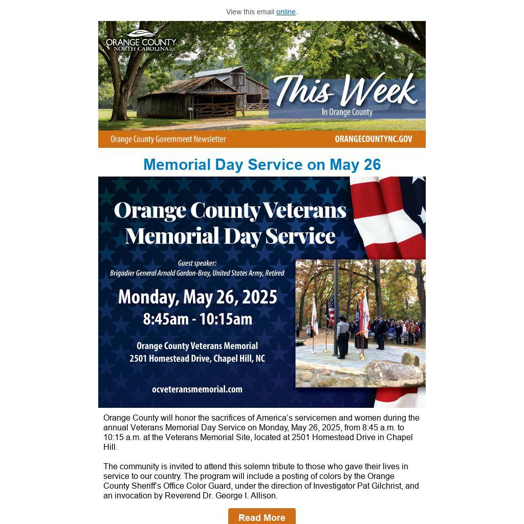 Orange County will honor the sacrifices of America’s servicemen and women during the annual Veterans Memorial Day Service on Monday, May 26, 2025, from 8:45 a.m. to 10:15 a.m. at the Veterans Memorial Site, located at 2501 Homestead Drive in Chapel Hill.