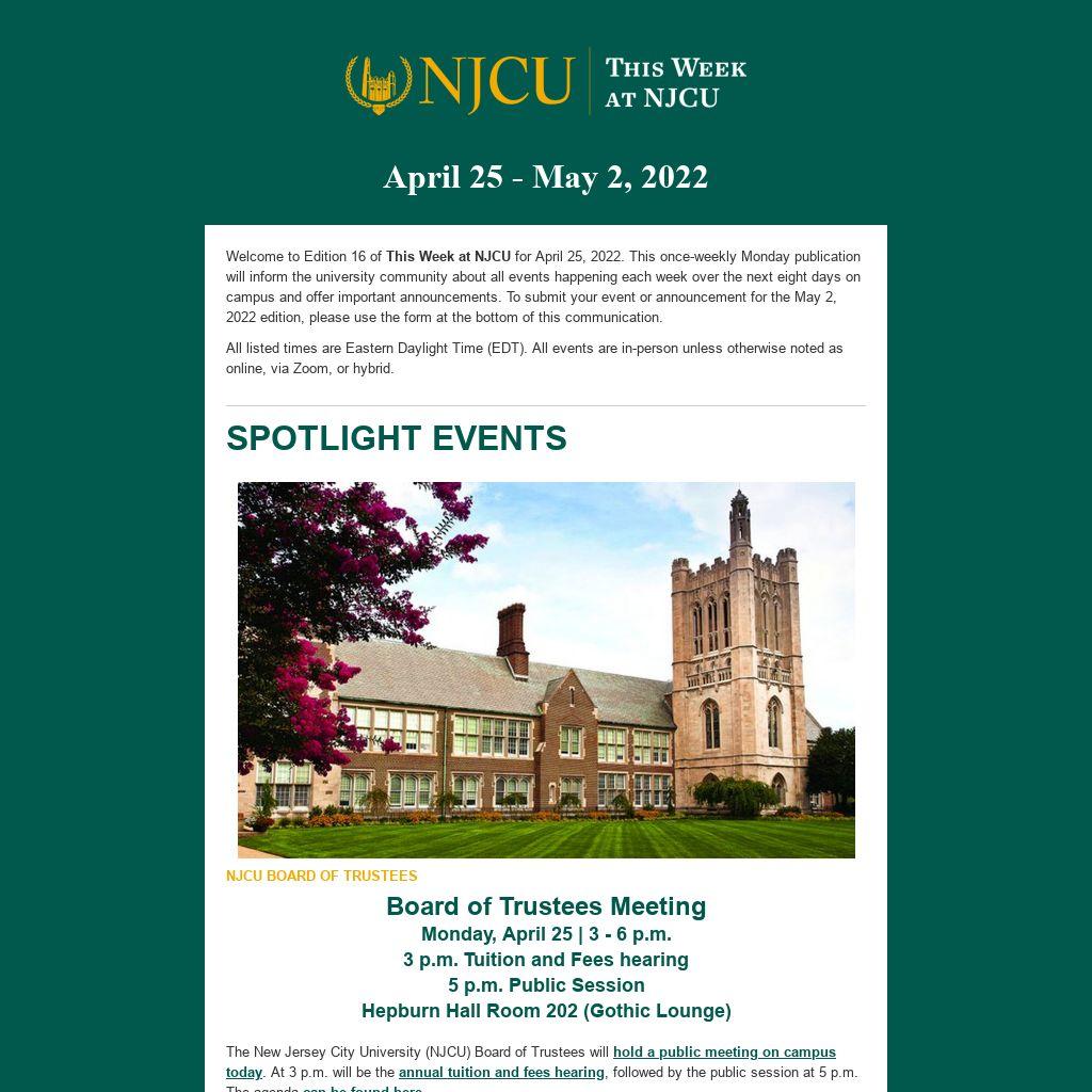 Welcome to Edition 16 of This Week at NJCU for April 25, 2022. This once-weekly Monday publication will inform the university community about all events happening each week over the next eight days on campus and offer important announcements. To submit your event or announcement for the May 2, 2022 edition, please use the form at the bottom of this communication.