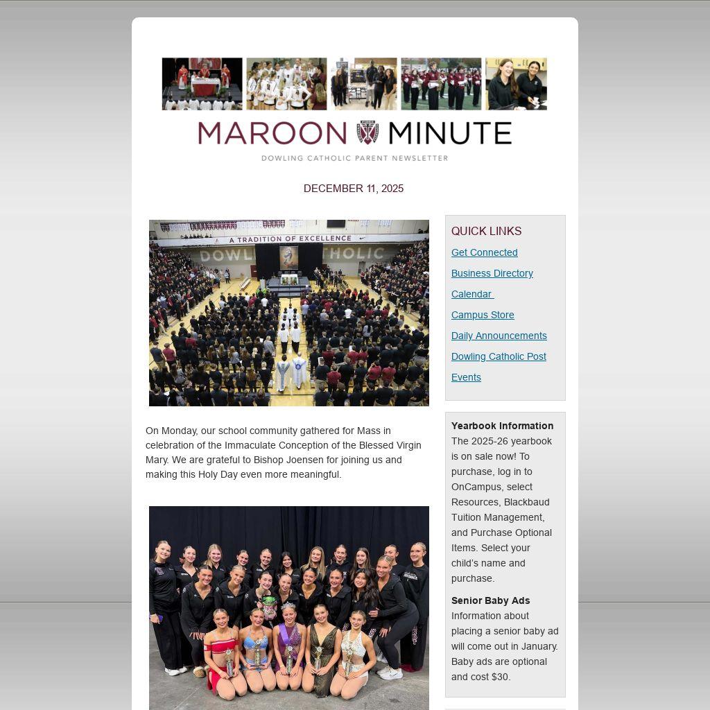 | The Maroon Fund We invite all families to support the Maroon Fund, Dowling Catholic's Annual Appeal, to help us prepare Leaders for Life, Centered on Christ. Your gift strengthens every aspect of the student experience by supporting three essential pillars: Academic Excellence, Student & Faith Life, and School Services. To learn more or make a gift, please visit our website. Checks may be mailed to DCHS, 1400 Buffalo Road, West Des Moines, IA 50265. Thank you for your support!