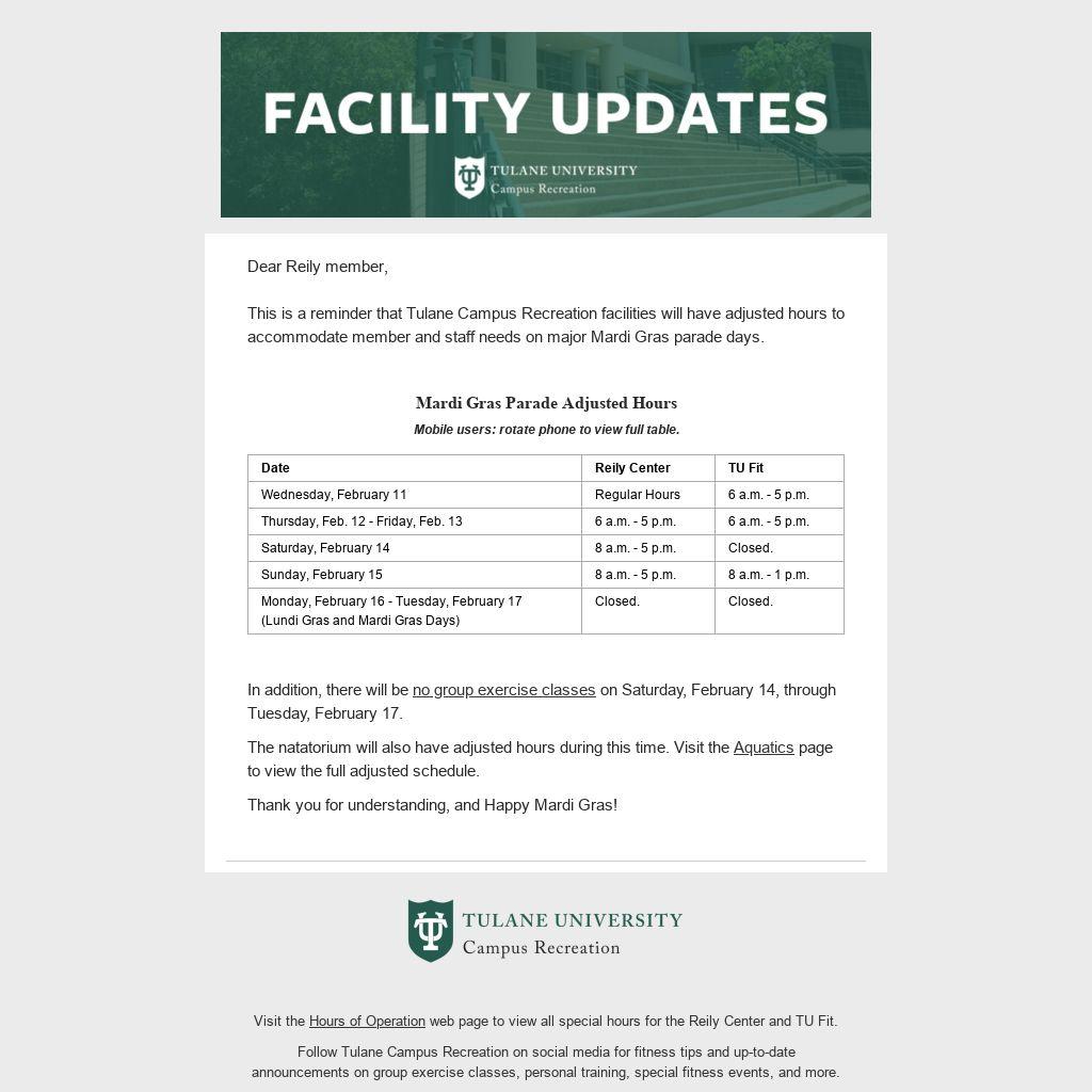 This is a reminder that Tulane Campus Recreation facilities will have adjusted hours to accommodate member and staff needs on major Mardi Gras parade days.