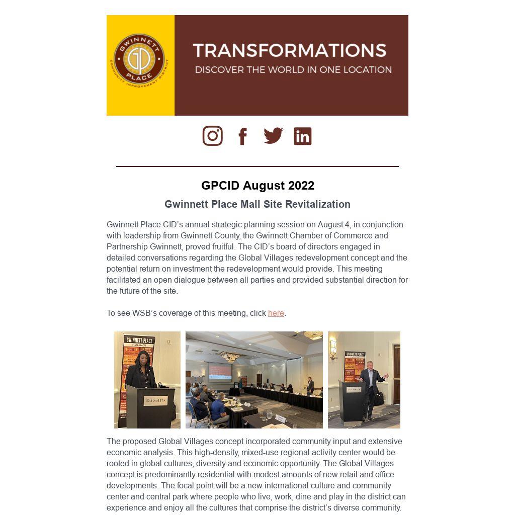 GPCID and the Gwinnett Place Mall revitalization team are excited about the opportunities this will bring to further revitalize the County’s central business district and primary economic engine. Next steps include a detailed implementation strategy slated for completion in September 2022. The Gwinnett Place Mall Site Revitalization team is currently drafting the final strategy document in coordination with key community stakeholders.