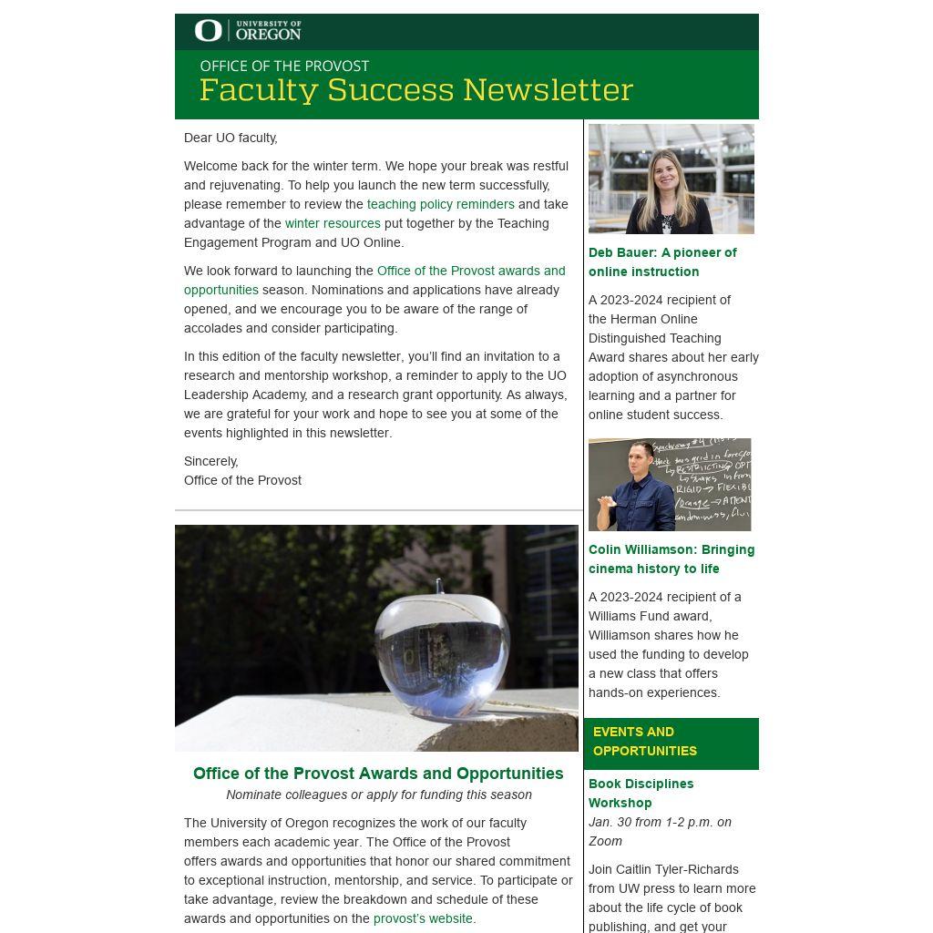 In this edition of the faculty newsletter, you’ll find an invitation to a research and mentorship workshop, a reminder to apply to the UO Leadership Academy, and a research grant opportunity. As always, we are grateful for your work and hope to see you at some of the events highlighted in this newsletter.