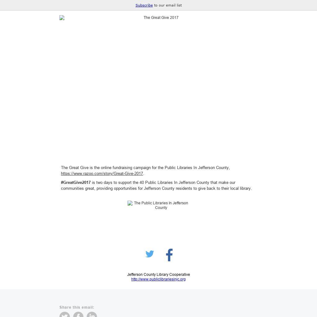 The Great Give is the online fundraising campaign for the Public Libraries In Jefferson County,